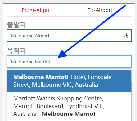 ☞ 목적지 -> 호텔 이름 Melbourne Marriott 복사 붙여넣기 (집이나 특정 장소 이동시에는 구글맵 기준 한글, 영어, 중국어, 일본어 주소를 입력하면 됩니다.)