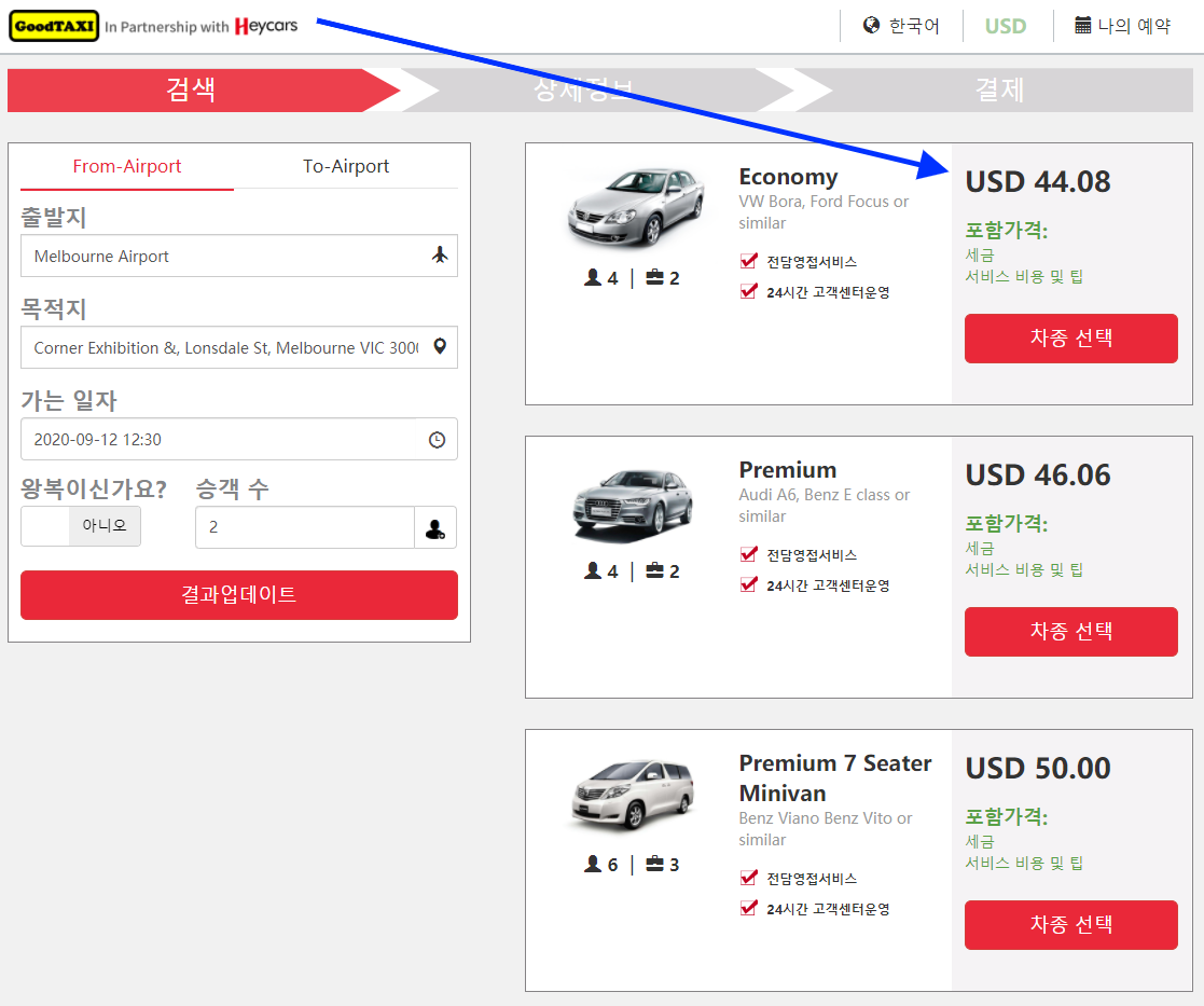 ☞ 검색 결과는 아래와 같습니다. (멜버른공항샌딩 은 편도 예약 후 쉽게 가능합니다.)