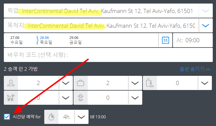 ☞ 픽업 날짜와 출발 셋팅과 시간당 예약에 체크 (4시간 설정)